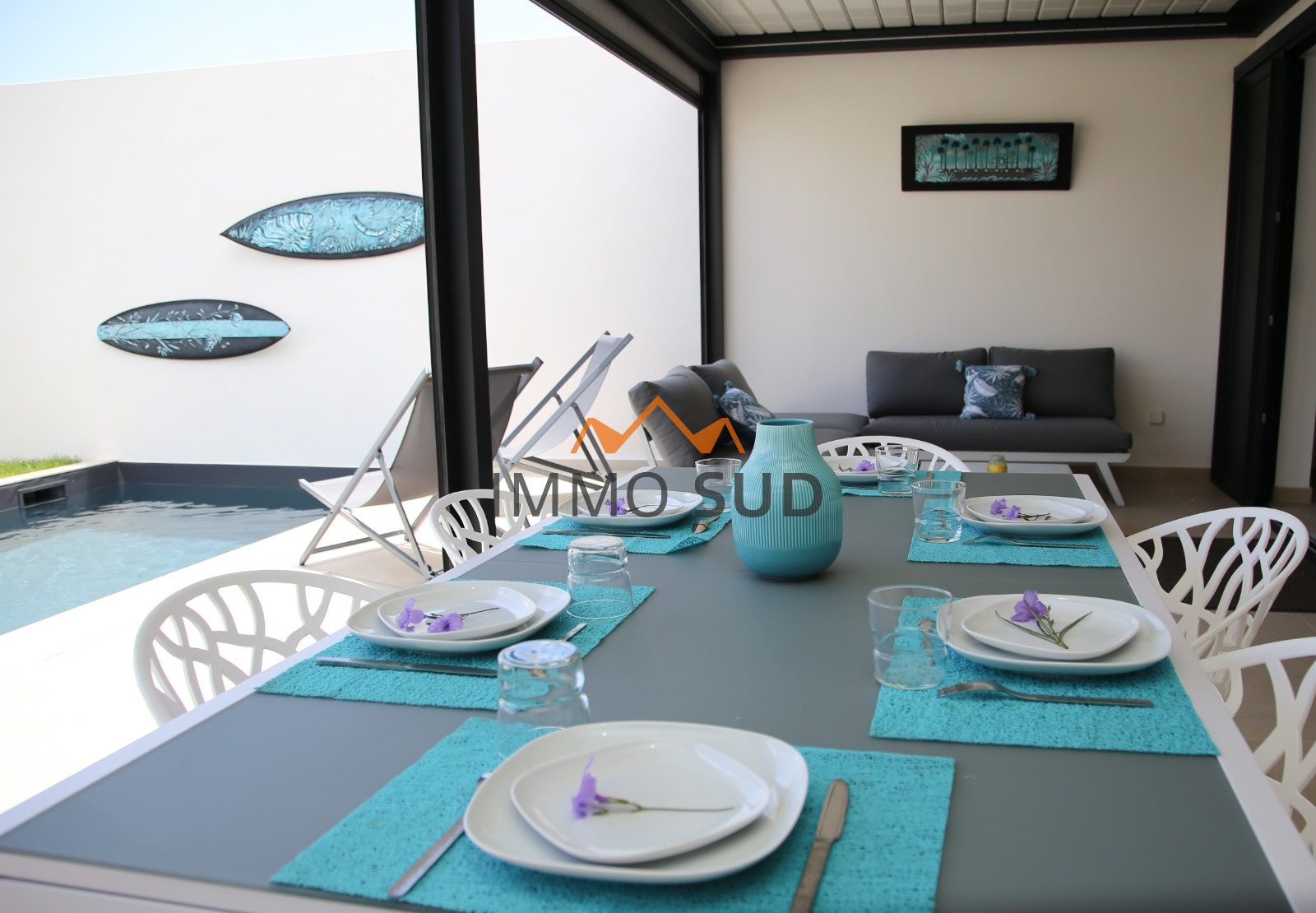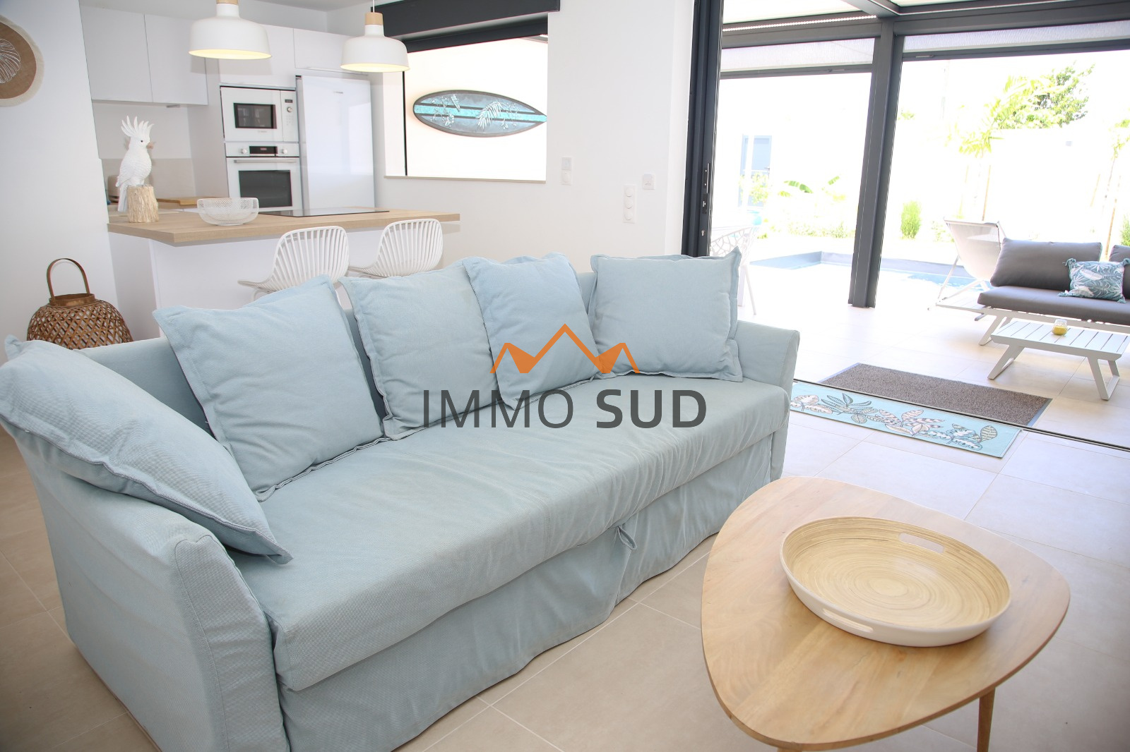 Villa avec piscine privée - Pièce principale avec canapé, Smart Tv, cuisine entièrement équipée (lave-vaisselle, four, four micro-ondes, plaque à induction, lave linge, Nespresso, grille pain, blender...) Grande terrasse couverte par une pergola bioclimatique donnant sur la piscine, avec coin repas, salon extérieur, chaises longues, douche piscine..