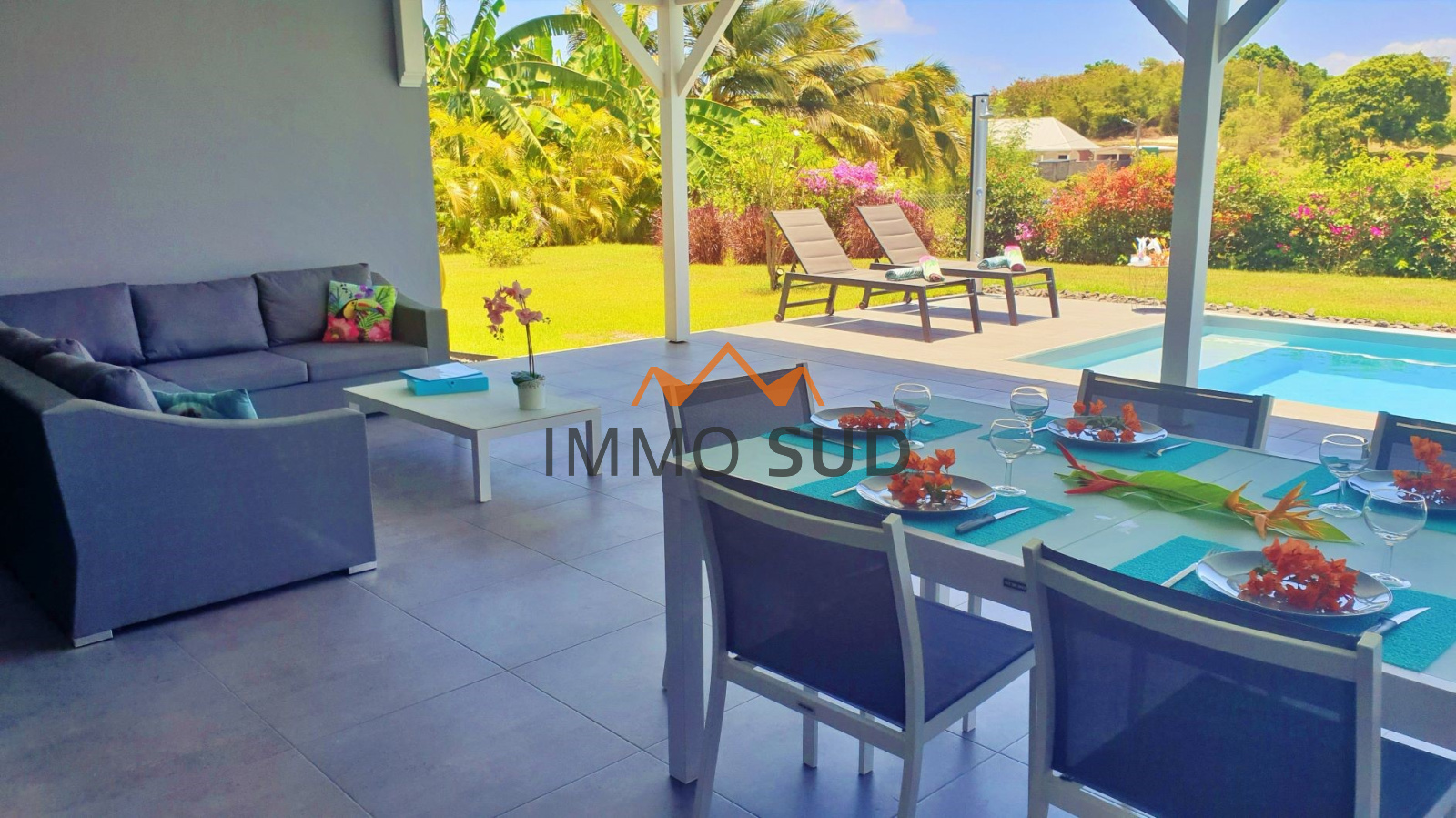 L’immense terrasse couverte (40 m²) devant la piscine vous invite à la farniente avec ses chaises longues.