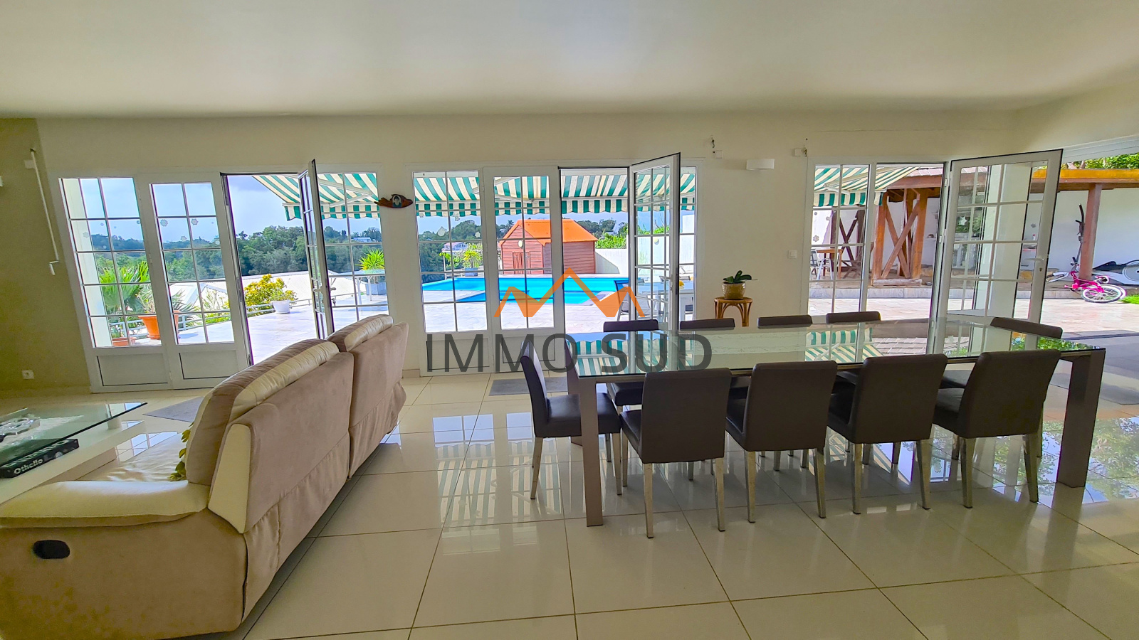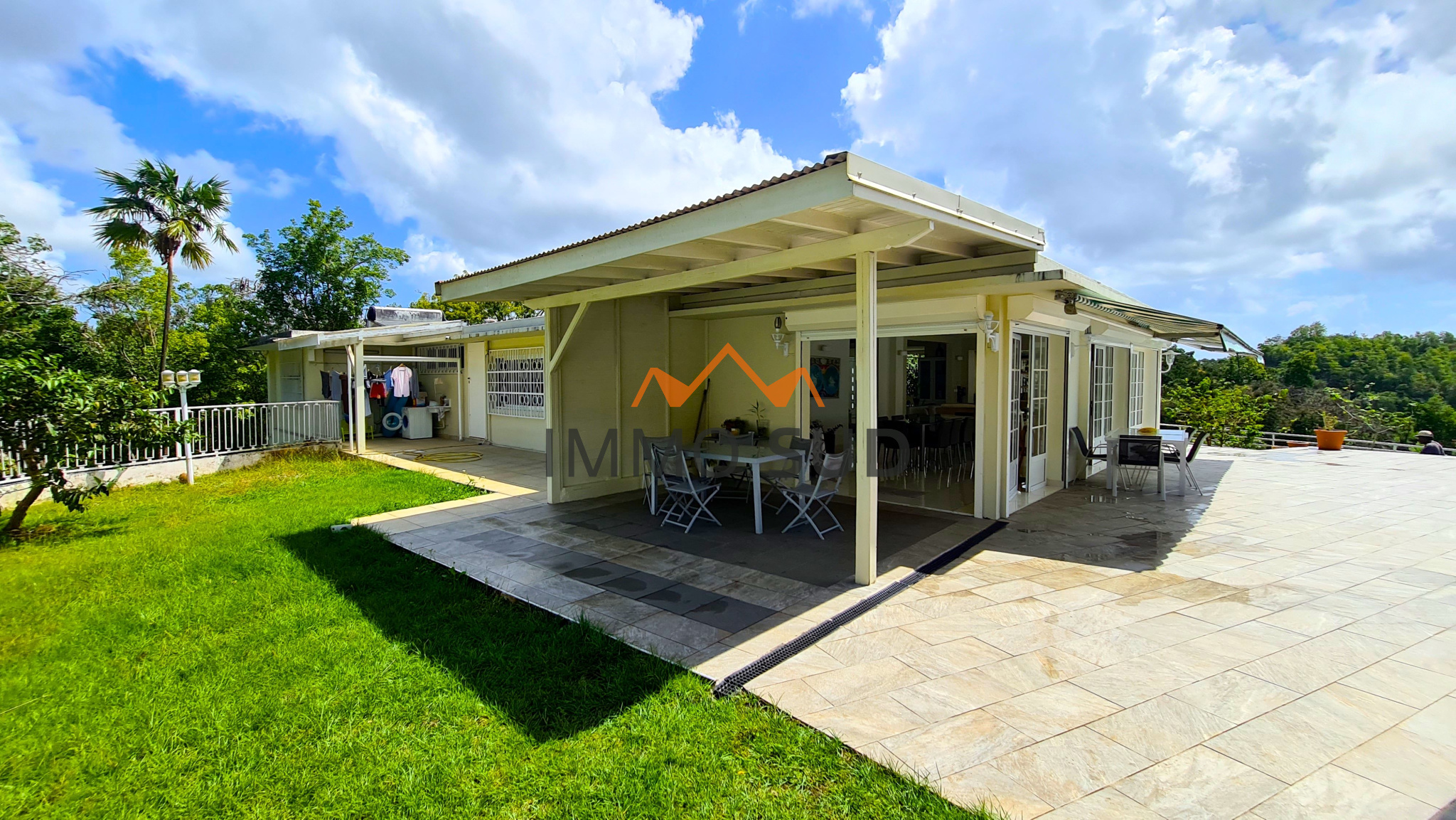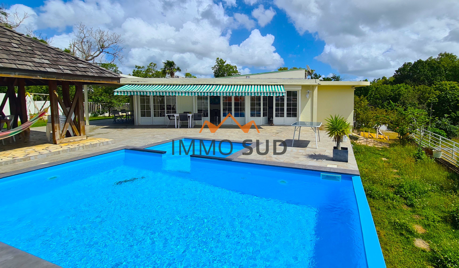 Elle est composée d'une grande pièce à vivre avec séjour, salle à manger, coin TV, bureau et une grande cuisine ouverte avec son cellier attenant, donnant sur une immense terrasse avec une piscine au sel vue dégagée, et un carbet avec son barbecue. Coté nuit vous avez 4 chambres : deux chambres d'enfants avec placards,avec une salle de bain et un wc dans le couloir, une chambre "d'ami" avec sa salle de bain attenante, une chambre parentale avec coin salon et une grande salle de bain.