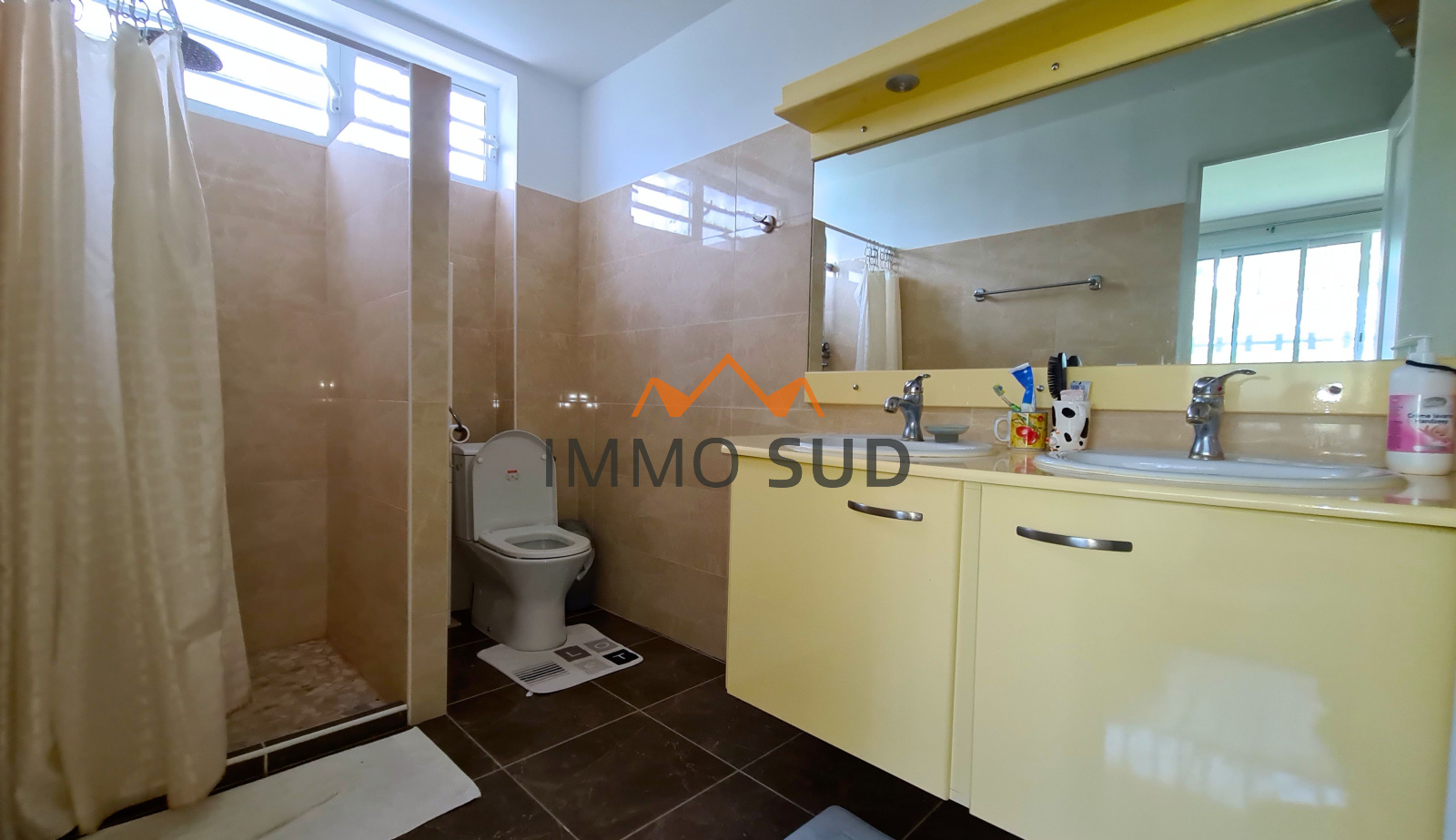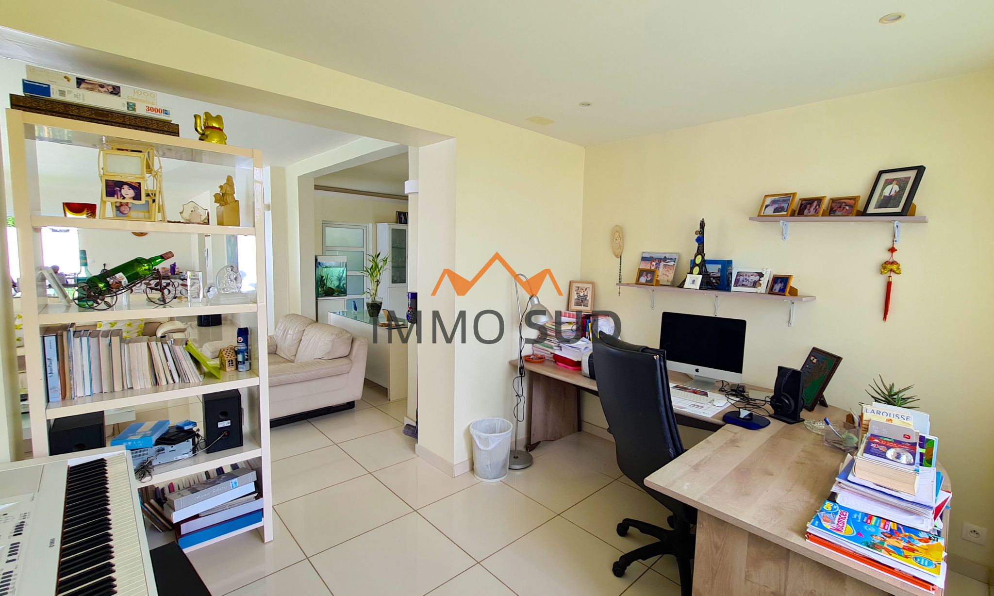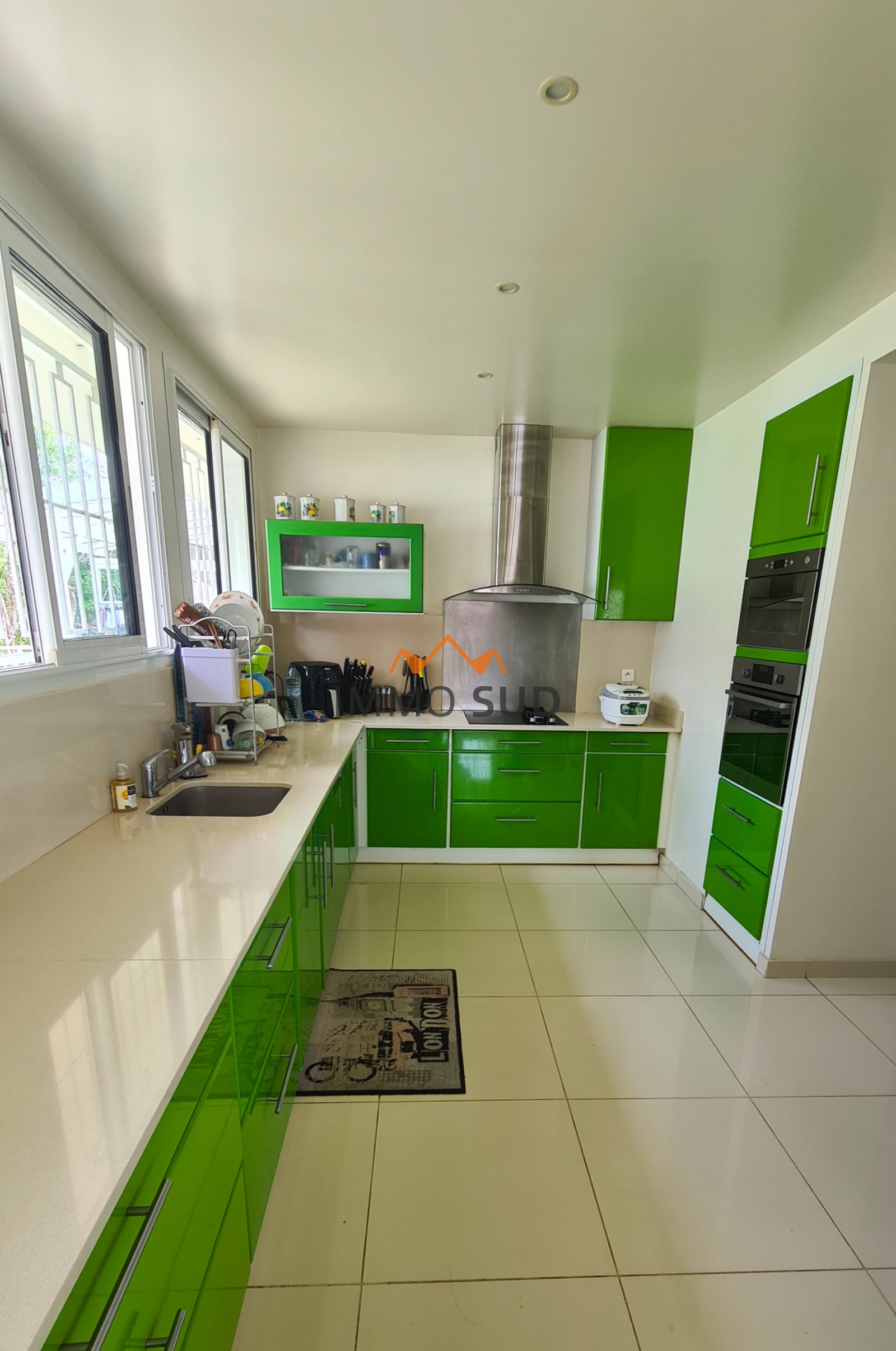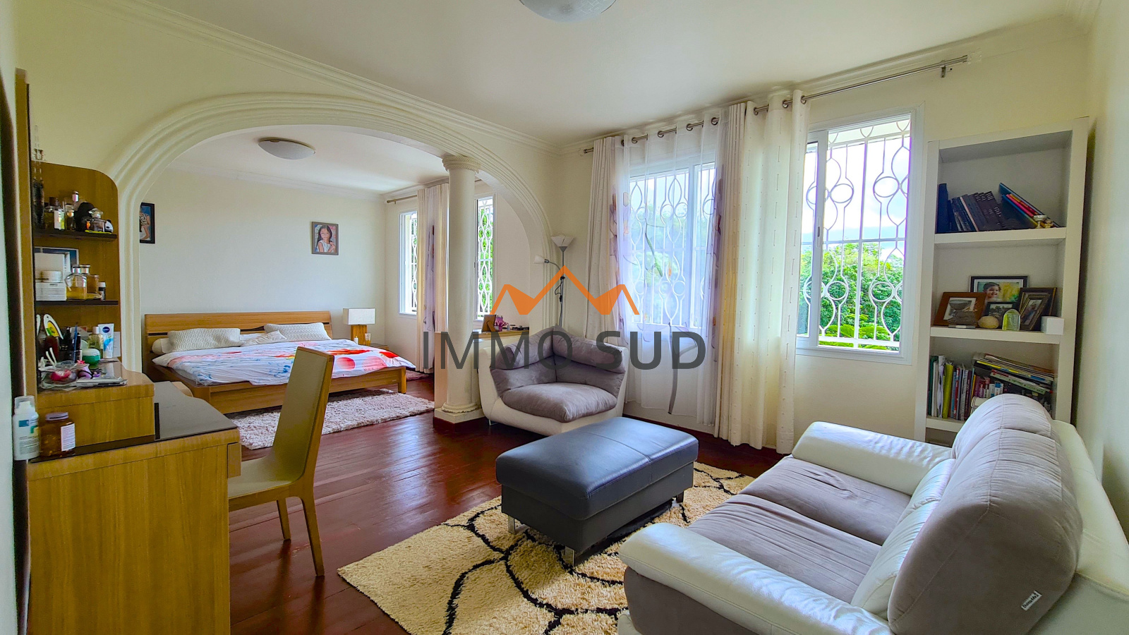 Elle est composée d'une grande pièce à vivre avec séjour, salle à manger, coin TV, bureau et une grande cuisine ouverte avec son cellier attenant, donnant sur une immense terrasse avec une piscine au sel vue dégagée, et un carbet avec son barbecue. Coté nuit vous avez 4 chambres : deux chambres d'enfants avec placards,avec une salle de bain et un wc dans le couloir, une chambre "d'ami" avec sa salle de bain attenante, une chambre parentale avec coin salon et une grande salle de bain.